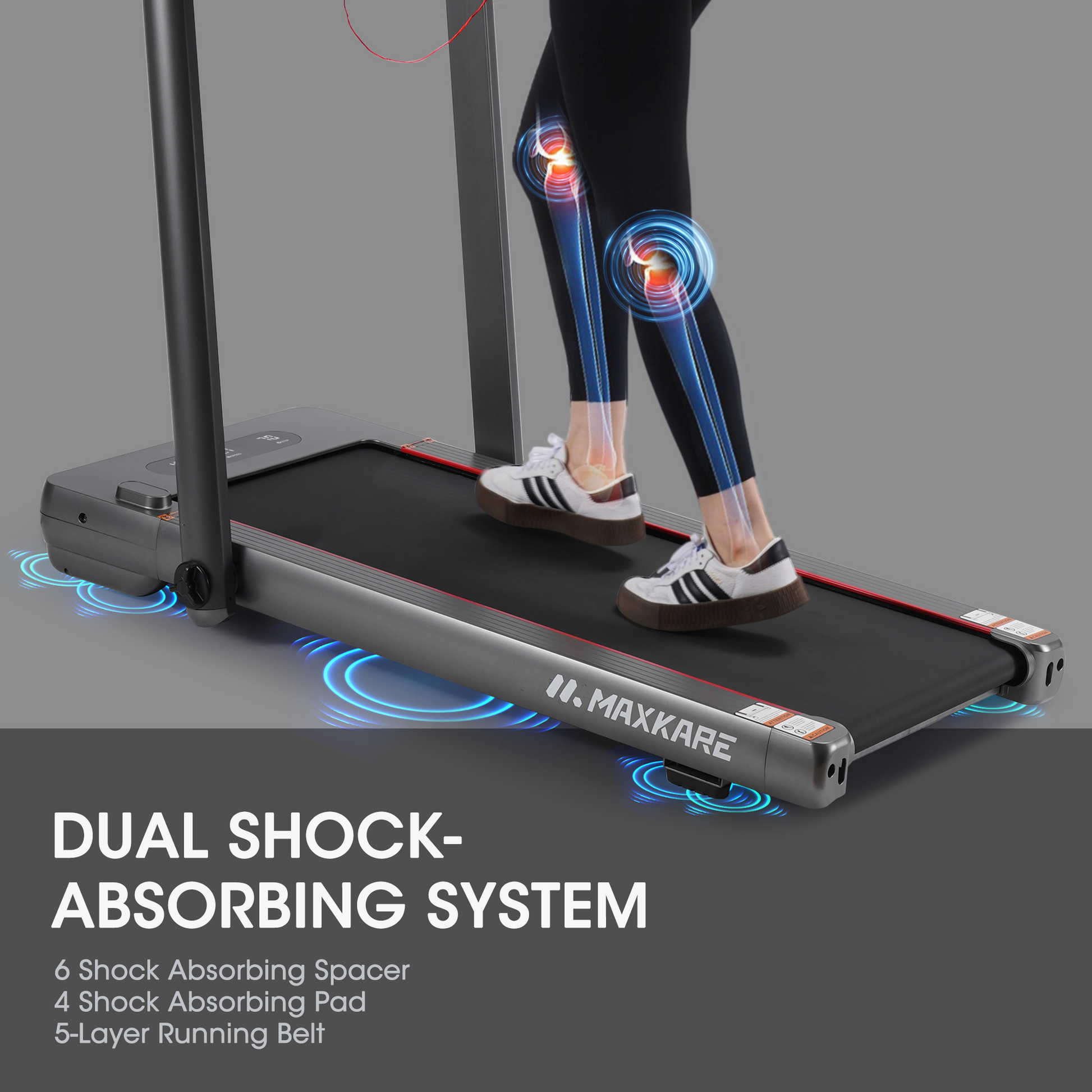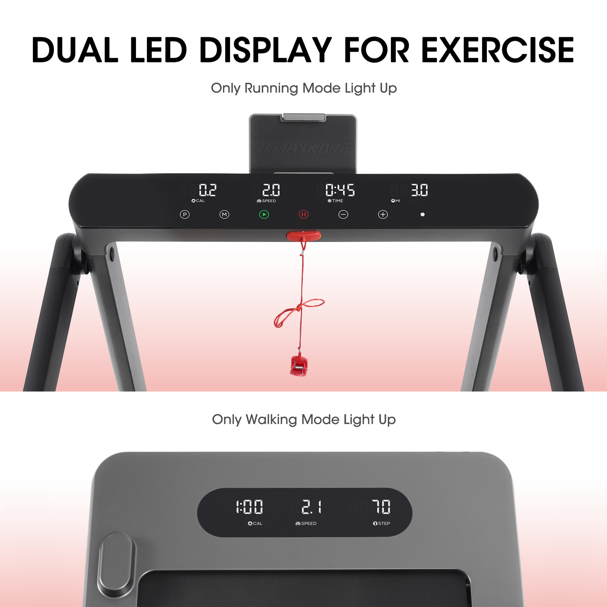 - Dual LED Display: MaxKare 2-in-1 treadmill has 2 LED displays, allowing real-time tracking of speed, distance, time, and calories. Running mode lights up upper display only, and walking mode lights lower display only.