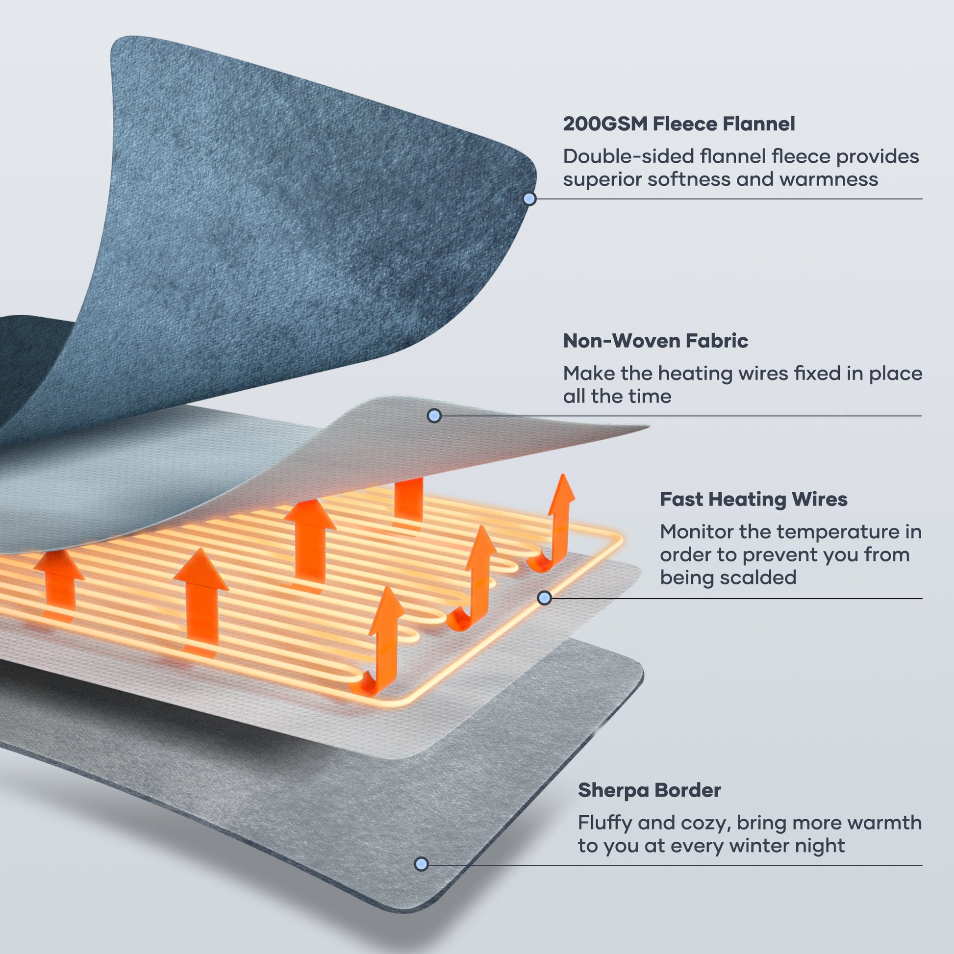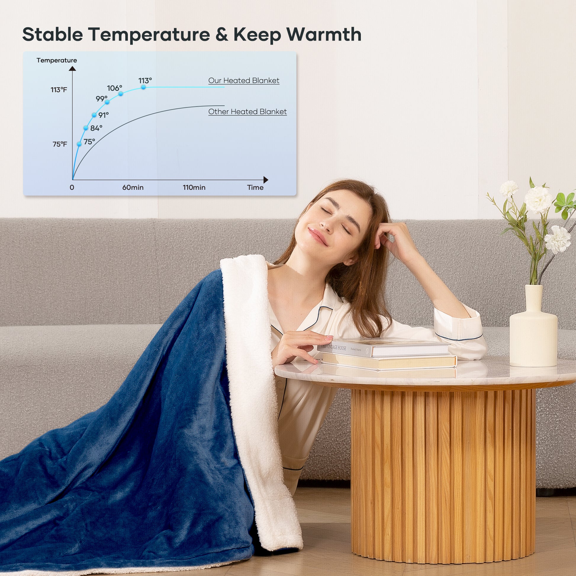 Heating Levels: 6 adjustable heating levels for personalized warmth and comfort. Timer Settings: 1 to 5-hour auto-off timer settings for safety and convenience. Soft Material: Made from luxuriously soft flannel and sherpa for optimal comfort. Safety Features: ETL certification and overheat protection ensure safe use. Full Body Coverage: Sized at 50" x 60" to provide comprehensive warmth. Easy Maintenance: Machine washable with a detachable controller for easy cleaning. Versatile Use: Long power cable allows flexible use in various settings. Perfect Gift: Ideal for gifting to friends and family during the holiday season.