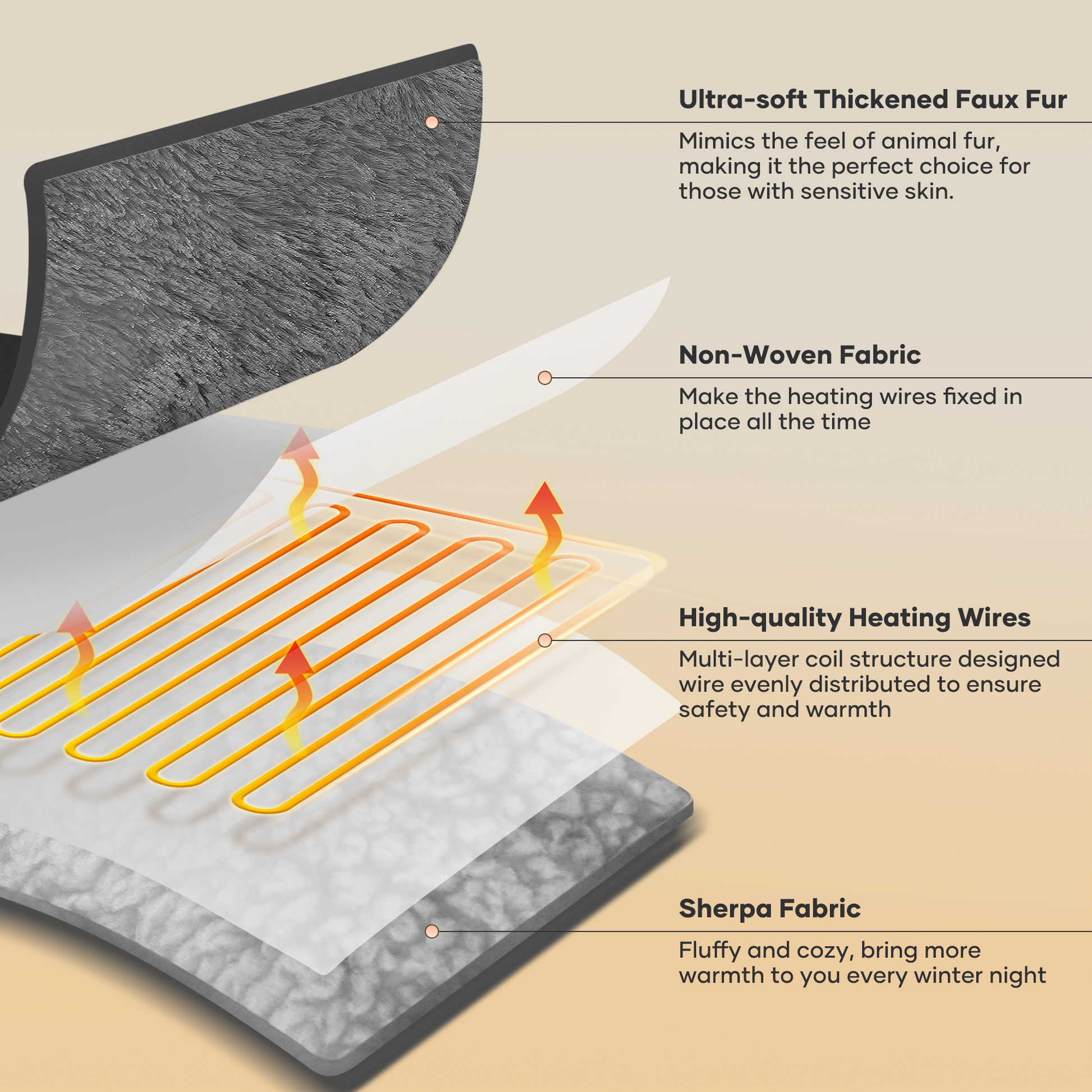 【Luxury Softness】Our heated double blanket features soft faux fur on one side and cozy velvet on the other, which evenly distributes heat to ensure you have a lightweight and fitted warmth experience, perfect for a good night's sleep.