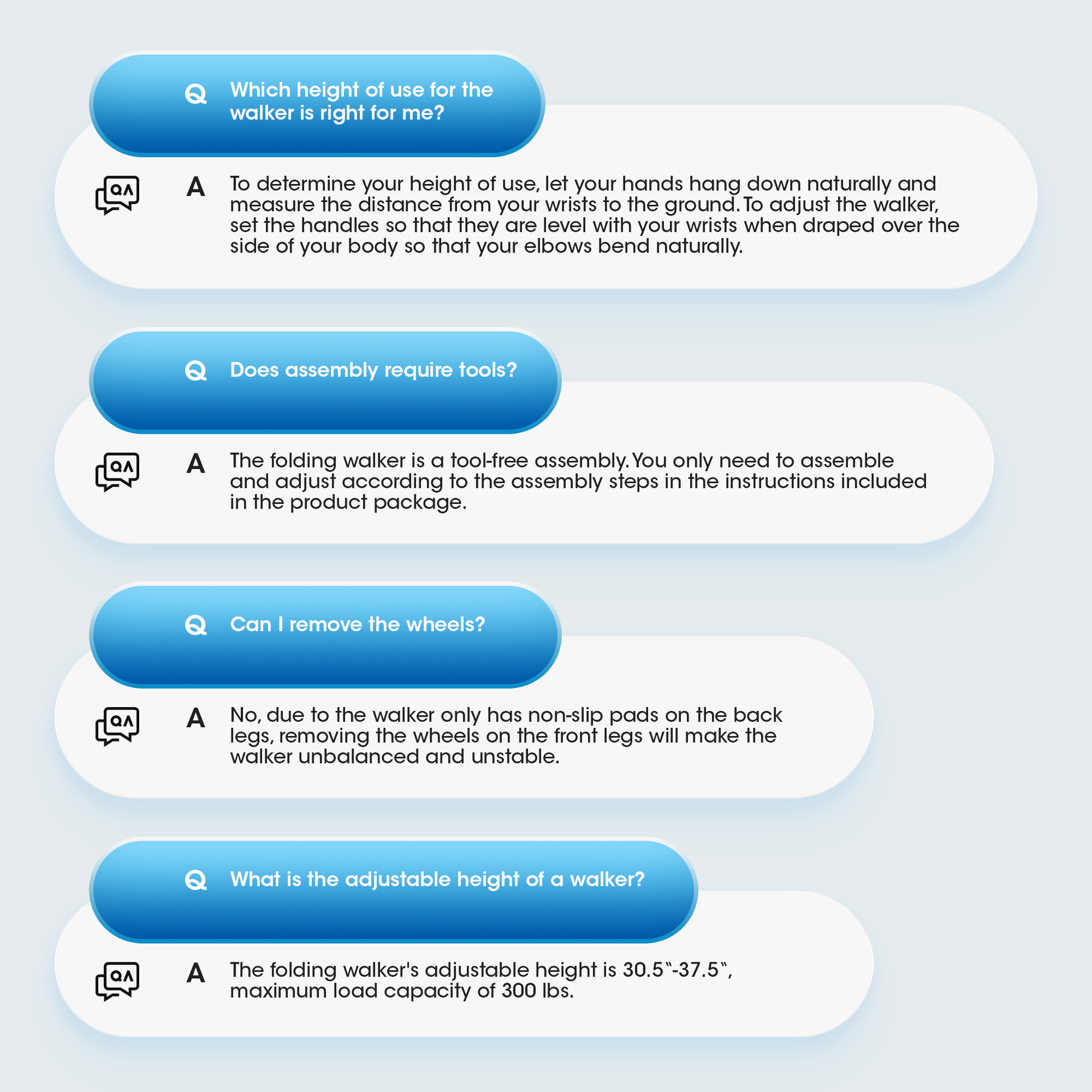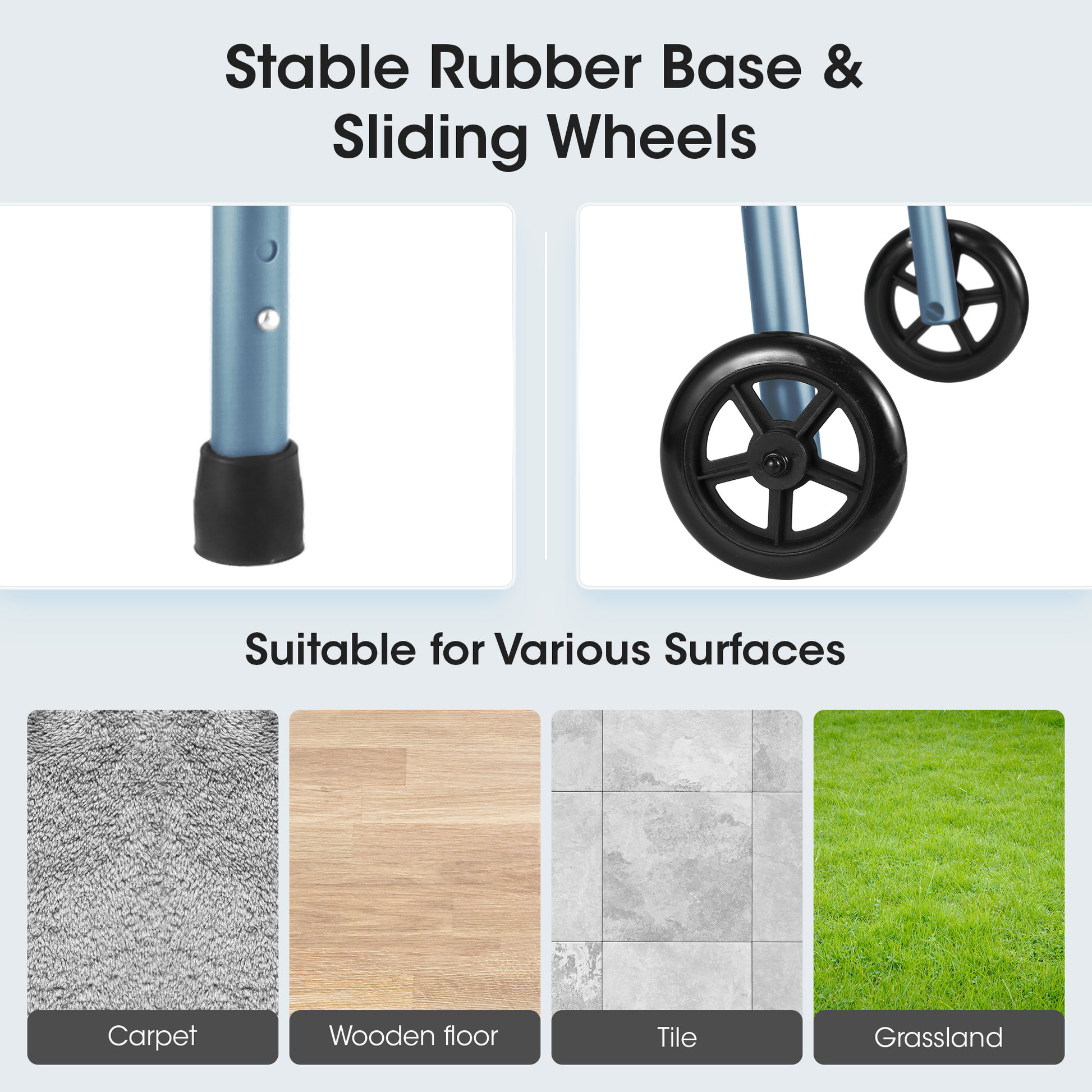 MaxKare Folding Walker is a stable and lightweight walker to help seniors and adults who need assistance for walking. Pushing the button locks on the leg can adjust the fit height quickly, the height adjustable from 30.5" to 37.5". The premium aluminum frame provides strength and stability for weight-bearing and arm support of individuals up to 300 pounds. Lifting the lock handles can easily fold the walker for transport or storage and won't pinch your fingers. The 5-inch sliding wheels are convenient for moving around the house or outside.