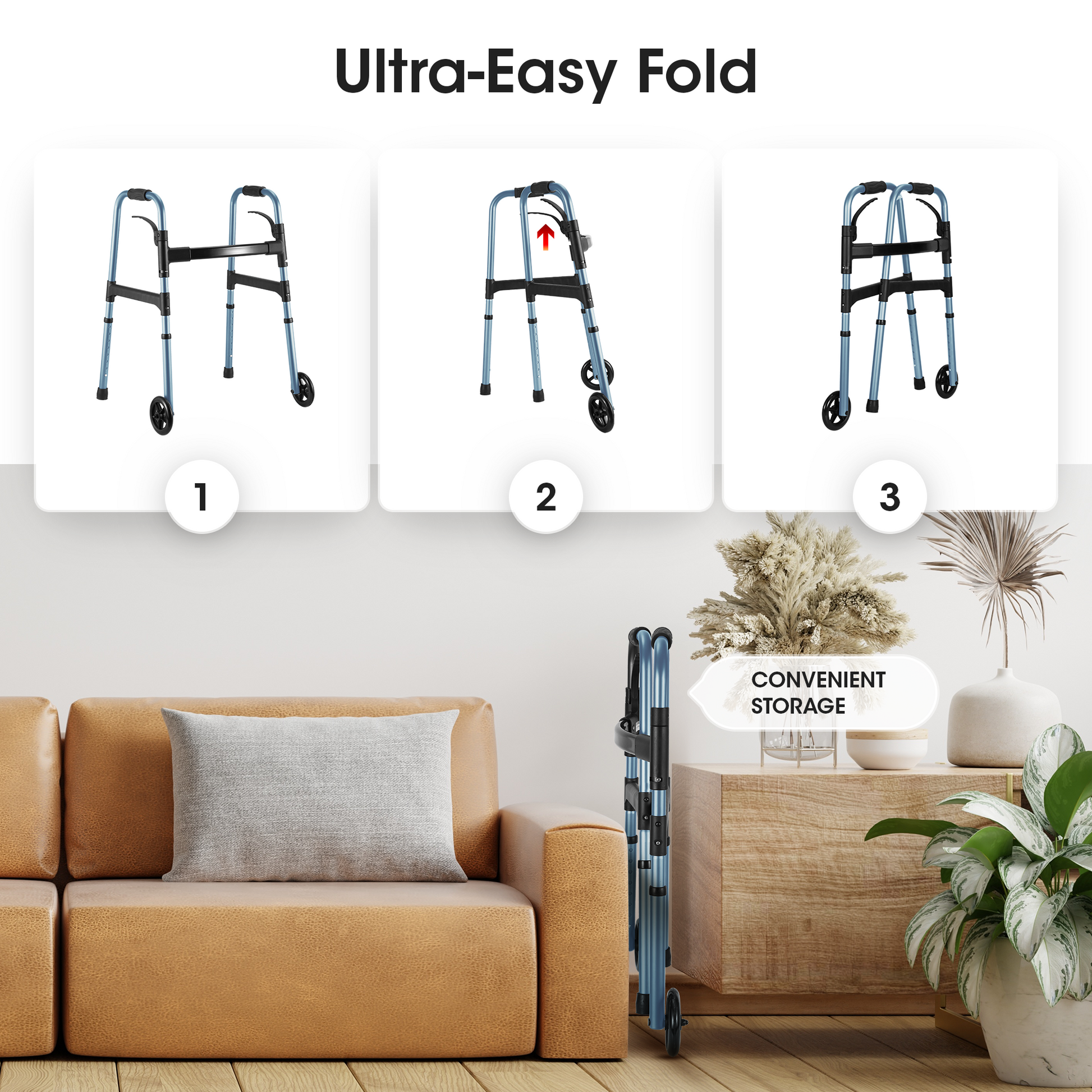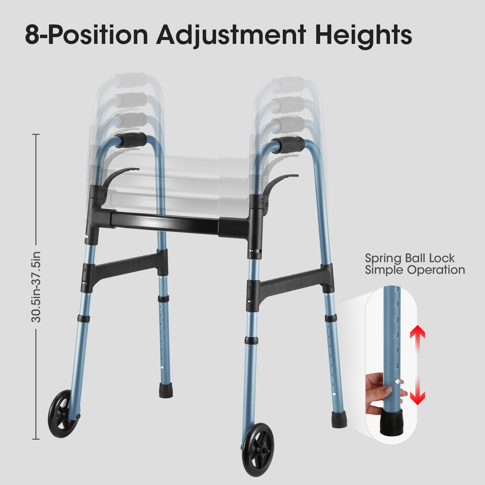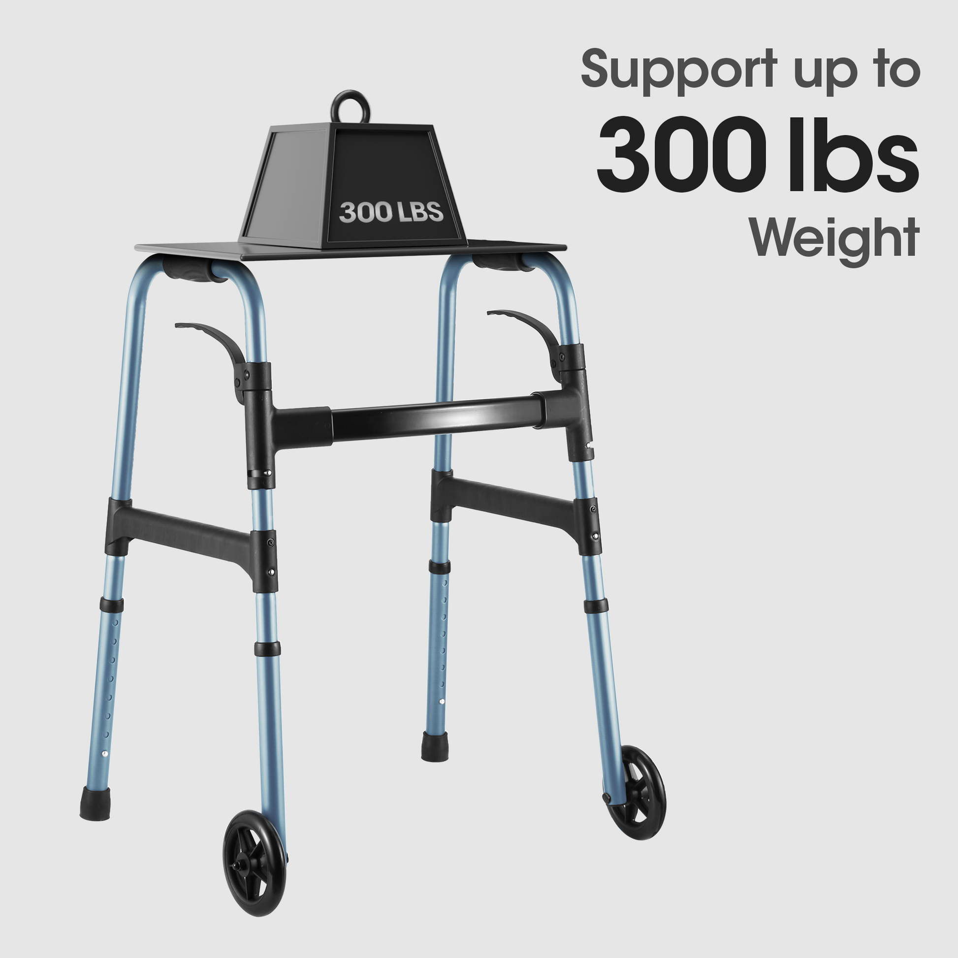MaxKare Folding Walker with Wheels, 30.5"-37.5" Adjustable Height, 300lbs Weight Capacity, Lightweight for Senior, Blue