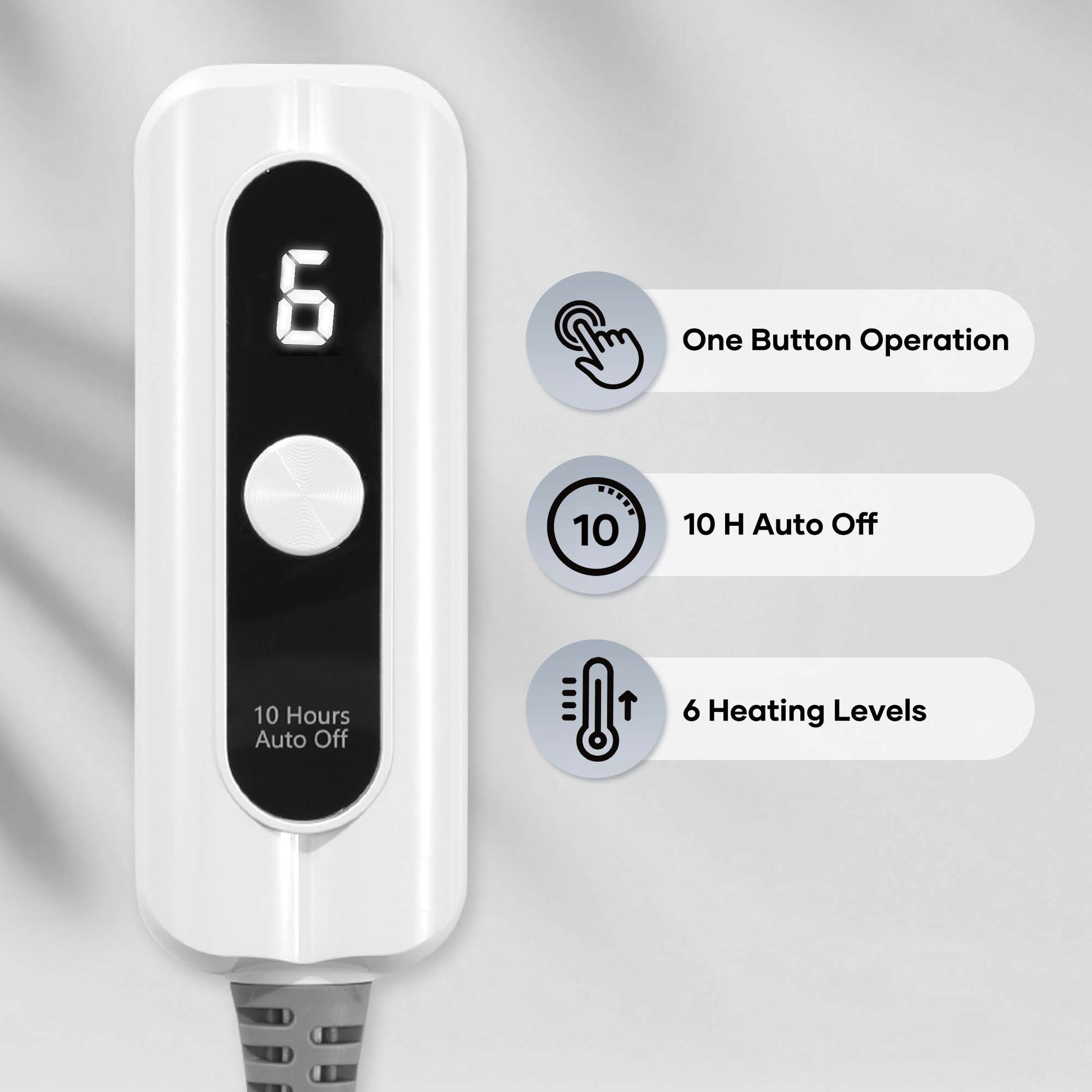 【One-key Operation & Fast Heating】- Just use one button to easily choose among 4 heating levels (range: 85℉~110℉) and make it heat up quickly, allowing you to feel warm and dispel the cold in the fastest time; with the 10-hour automatic shutdown function, so you can rest assured to enjoy.