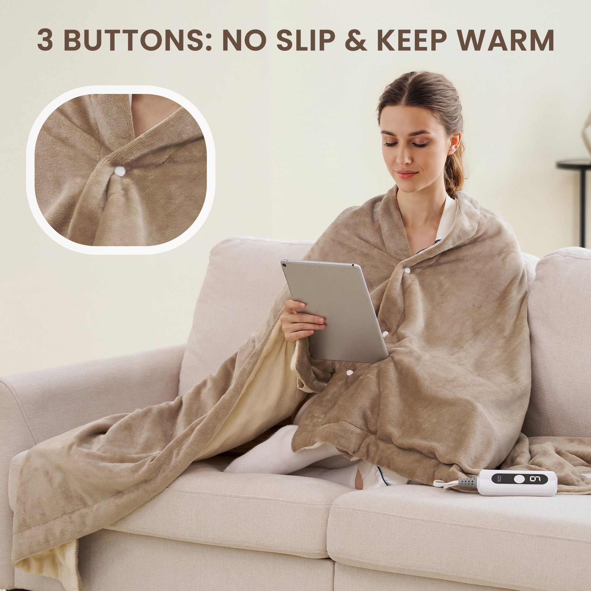 Updated 3 Fix Buttons: Adjust the blanket's fixed wrapping range, so that your hands can also be wrapped under the electric blanket in winter.