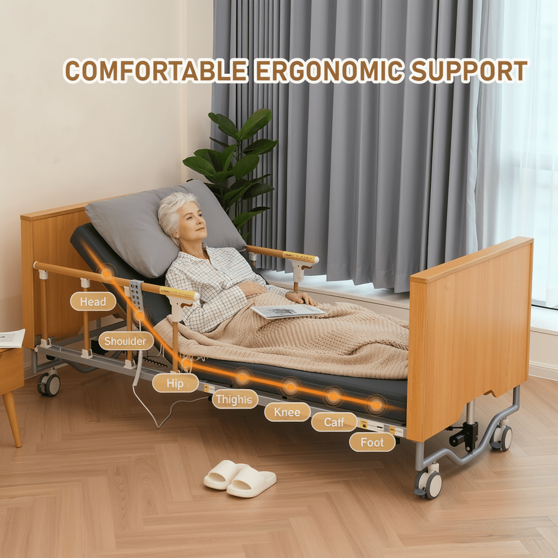 Featuring a heavy-duty steel frame structure capable of supporting 500 lbs, it ensures reliable stability. Fully electric adjustment (head/foot/height) via remote control allows for easy personalized positioning. The adjustable bed height facilitates transfer and care, while the semi-guardrail combines safety and flexibility. The foam mattress effectively relieves pressure, promoting comfortable sleep.