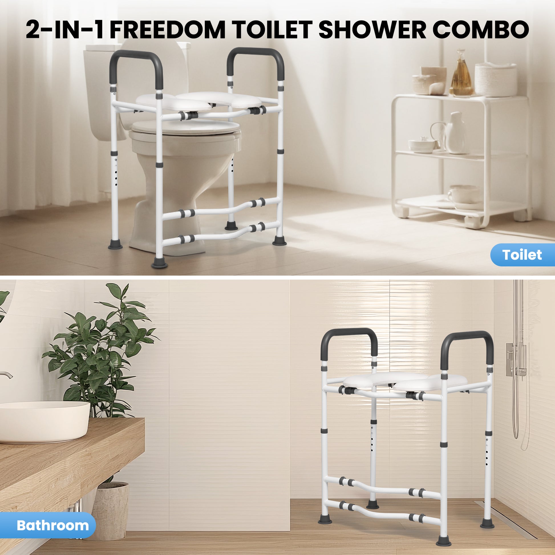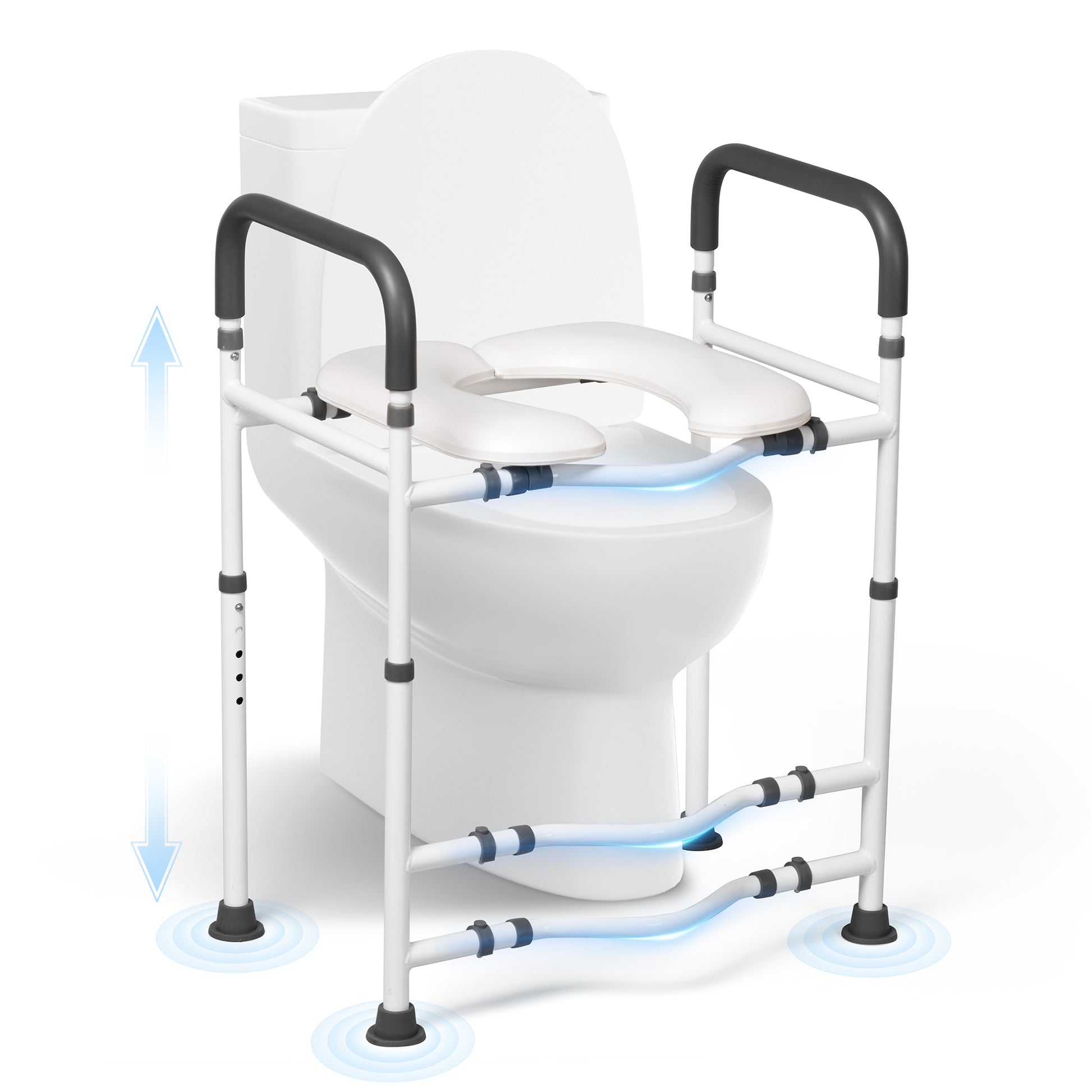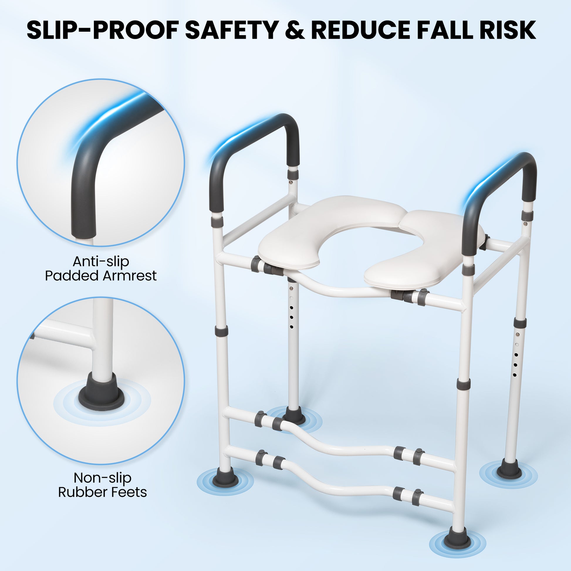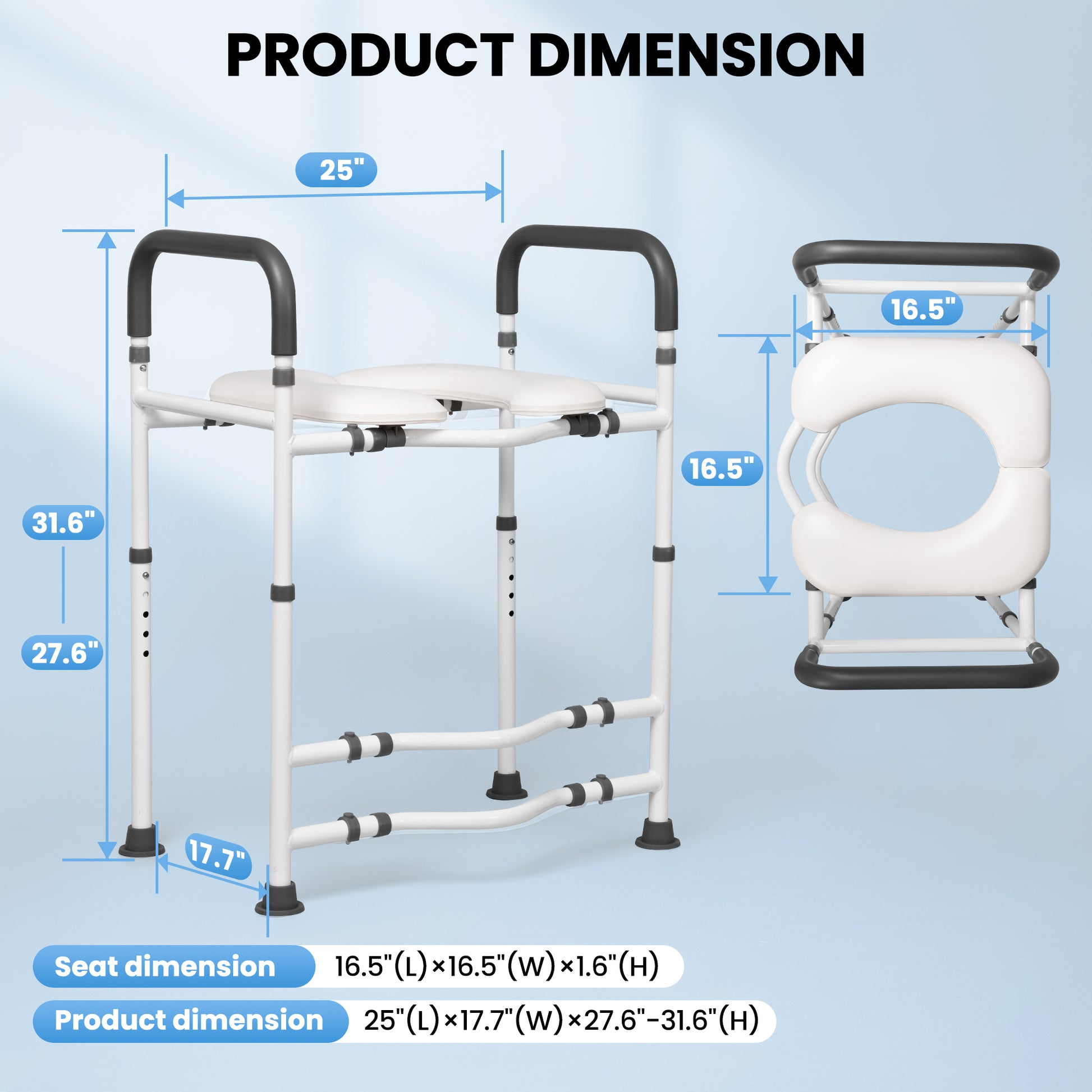 MaxKare Raised Toilet Seat provides safe and comfortable use, significantly reducing strain on knees, hips, and back to assist seniors and individuals with mobility issues in sitting and standing independently. Its welded one-piece frame and curved pipe structure ensure strong stability, supporting up to 300 lbs without wobbling. The handle is covered with soft waterproof foam for a secure grip, and anti-skid rubber legs keep the base firmly in place. The 16.5″ padded seat features a non-slip surface for added safety and comfort. Waterproof and detachable, the cushion allows easy cleaning. With 5 height adjustments from 27.6″ to 31.6″, toilet seat riser suits a variety of users including the elderly, disabled, pregnant women, and post-surgery restorers.