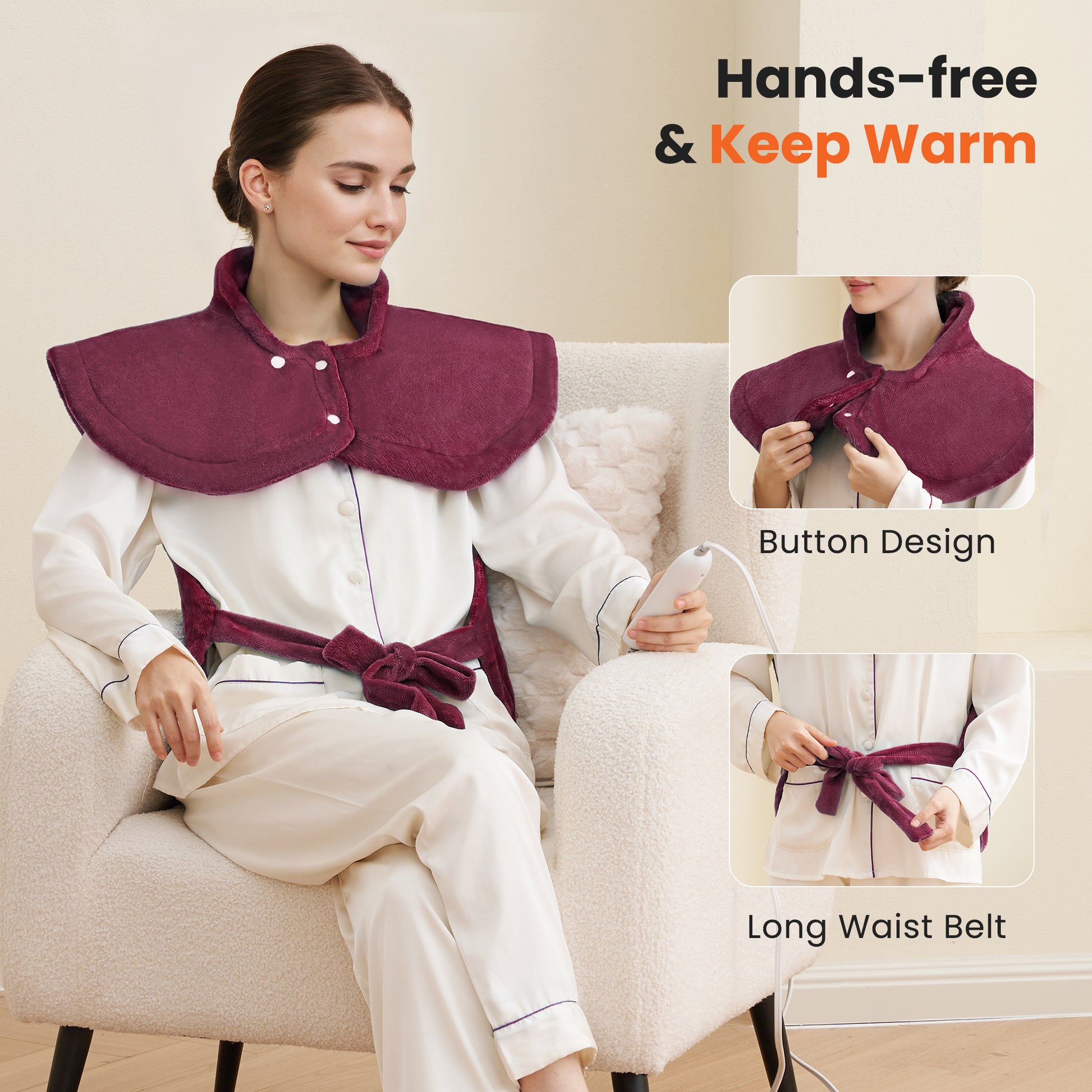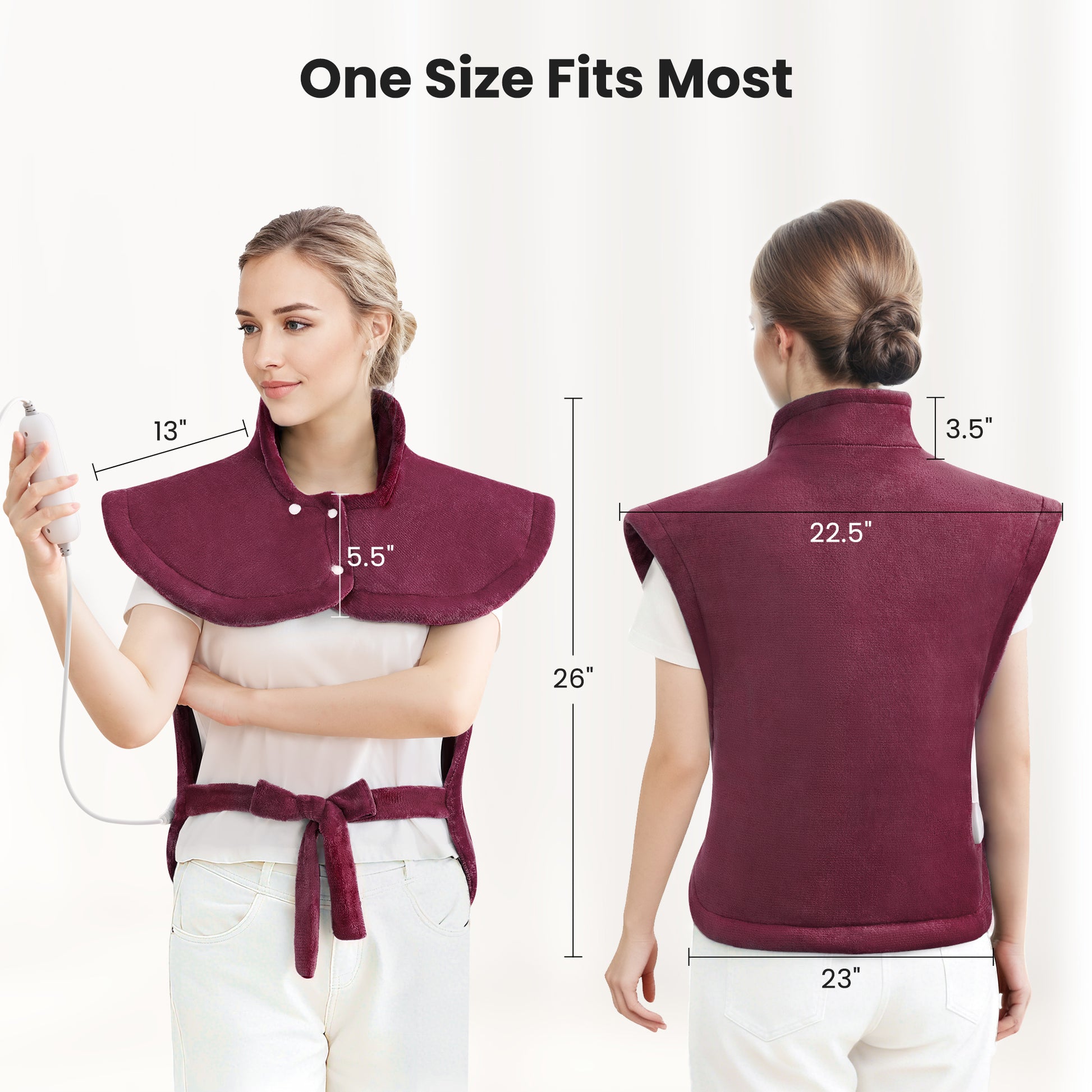- Extra large: The heating pad measures 24"x33", offering more comprehensive care along the neck, shoulders, and back.